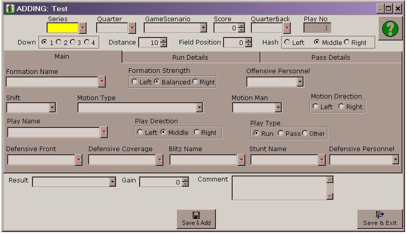 The MAIN Tab shown below contains descriptive information about the type of Formation and Play run by the Offensive team and the Type of Defensive Scheme used by the Defense. Information about Personnel groups on Offense or Defense as well as information about Shifts and Motion used by the Offense can also be entered in this section. This information is collected just prior to the snap and as the play develops.