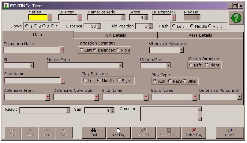 The four VCR type buttons on the lower left side of the Play Entry Screen allows for easy navigation through plays in a single game. The three buttons to the lower right provide options such as save changes, cancel changes, and delete the play to the current record. The two buttons in the middle provide a Find function allows the user to locate plays in a game or ADD plays to the game.