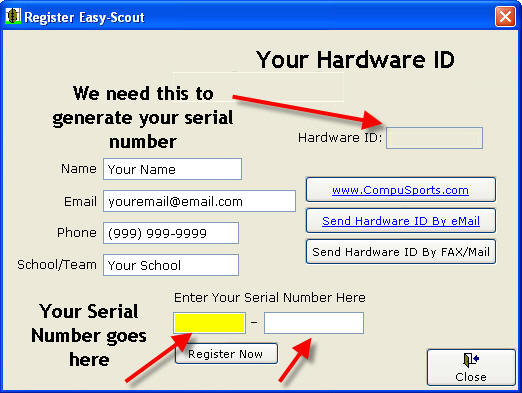 sample "Register Easy-Scout" screen below. The Hardware ID number is unique to every computer (i.e. every computer will display